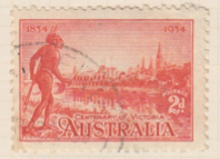 According to The West Australian newspaper, the centennial stamp shows a scene (1834) “of an aboriginal on the banks of the River Yarra, with the north bank in its primeval state, while the right hand panel shows the skyline of Melbourne (1934) as seen from the same spot on the south bank of the river.” |
